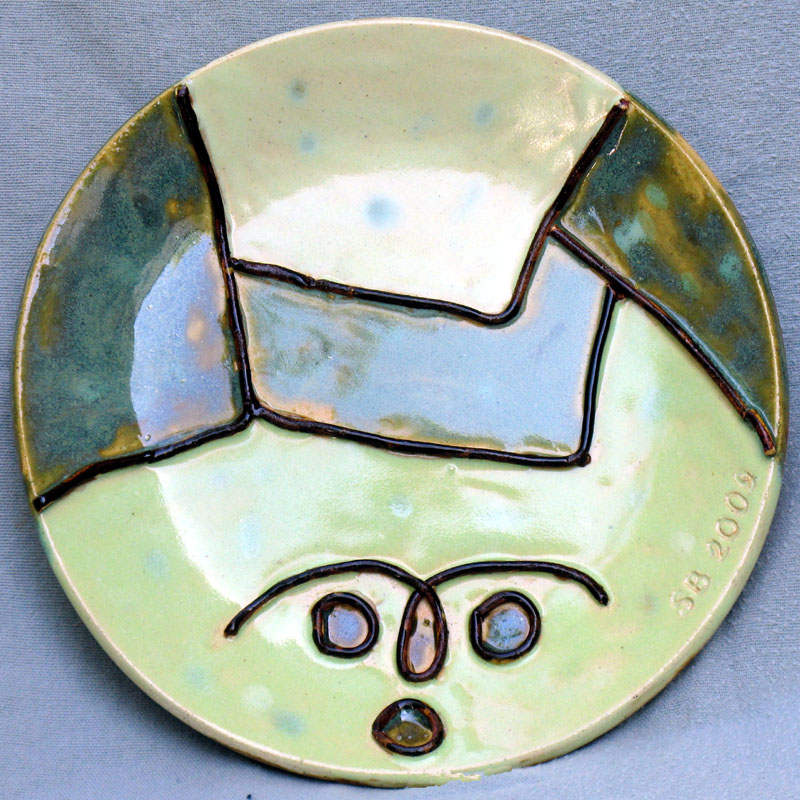 # 0535. Saucer. Mask. Thrown and altered stoneware, d. 7.5 in, 2009