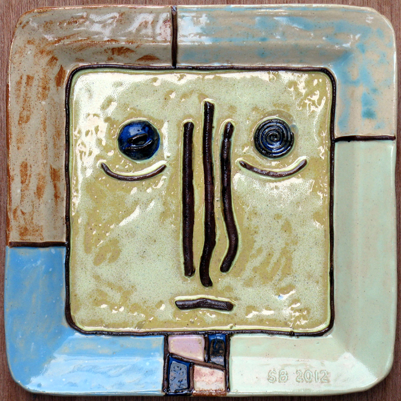 # 0664. Plate. Mask. Thrown and altered stoneware, 9.5 x 9.5 in, 2012