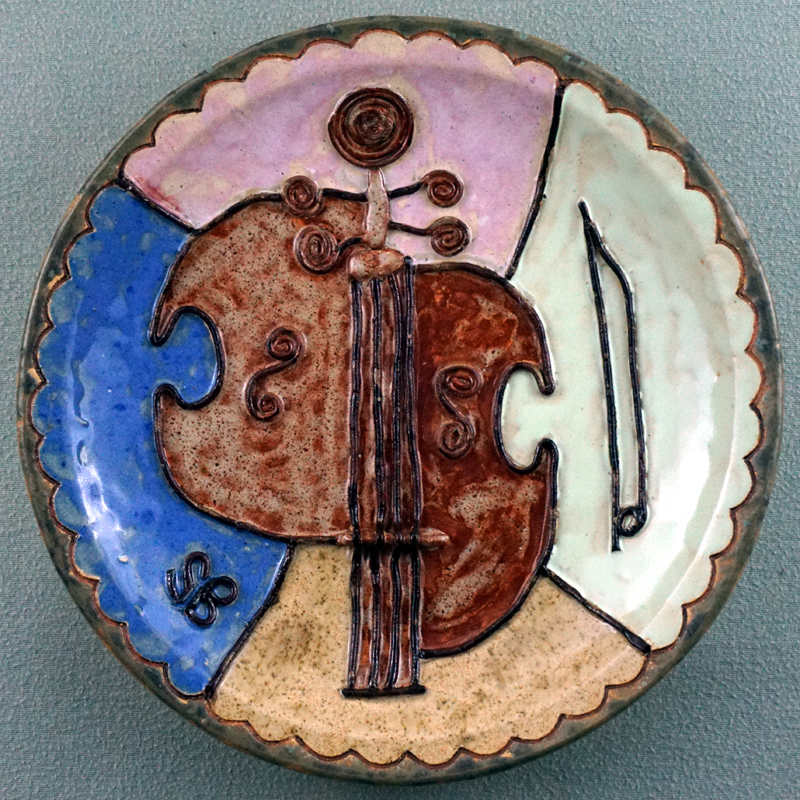 # 0901. Plate. Violin. Thrown and altered stoneware, d. 10.5 in, 2019