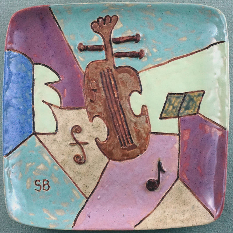 # 0928. Plate. Violin. Thrown and altered stoneware, 9.5 x 9.5 in, 2019