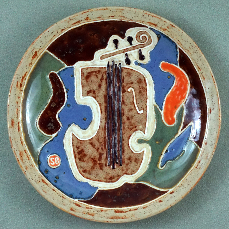 # 0975. Plate. Violin. Thrown and altered stoneware, d. 10.5 in, 2021