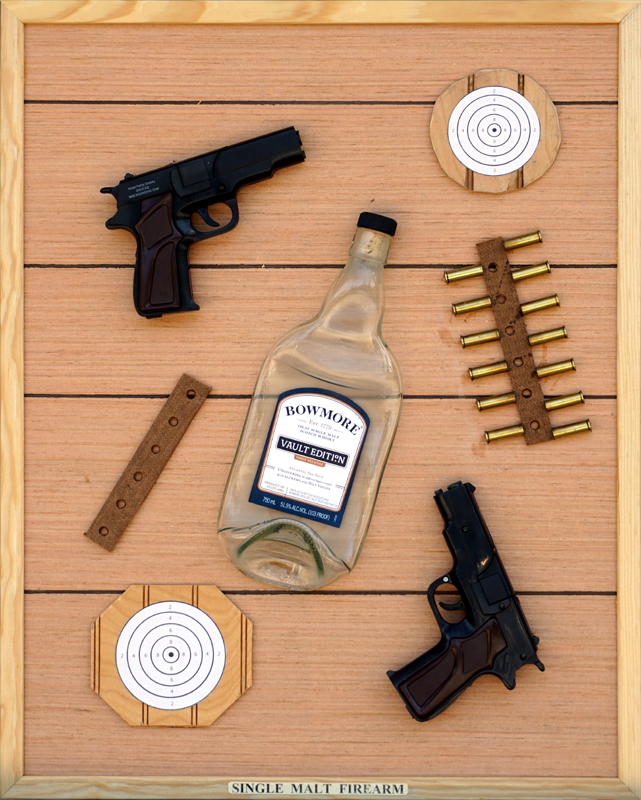 Single Malt Firearm (2024). Mixed Media, 24 x 19 in.